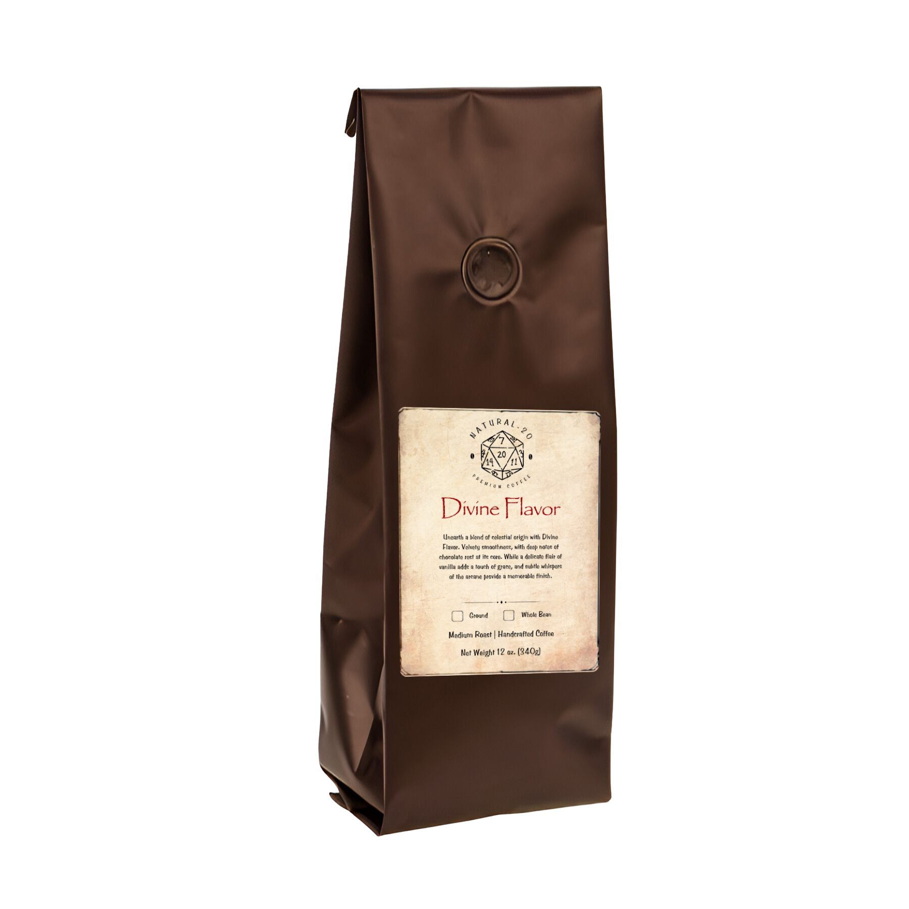 Unearth a blend of celestial origin with Divine Flavor. Velvety smoothness, with deep notes of chocolate rest at its core. While a delicate flair of vanilla adds a touch of grace, and subtle whispers of the arcane provide a memorable finish.