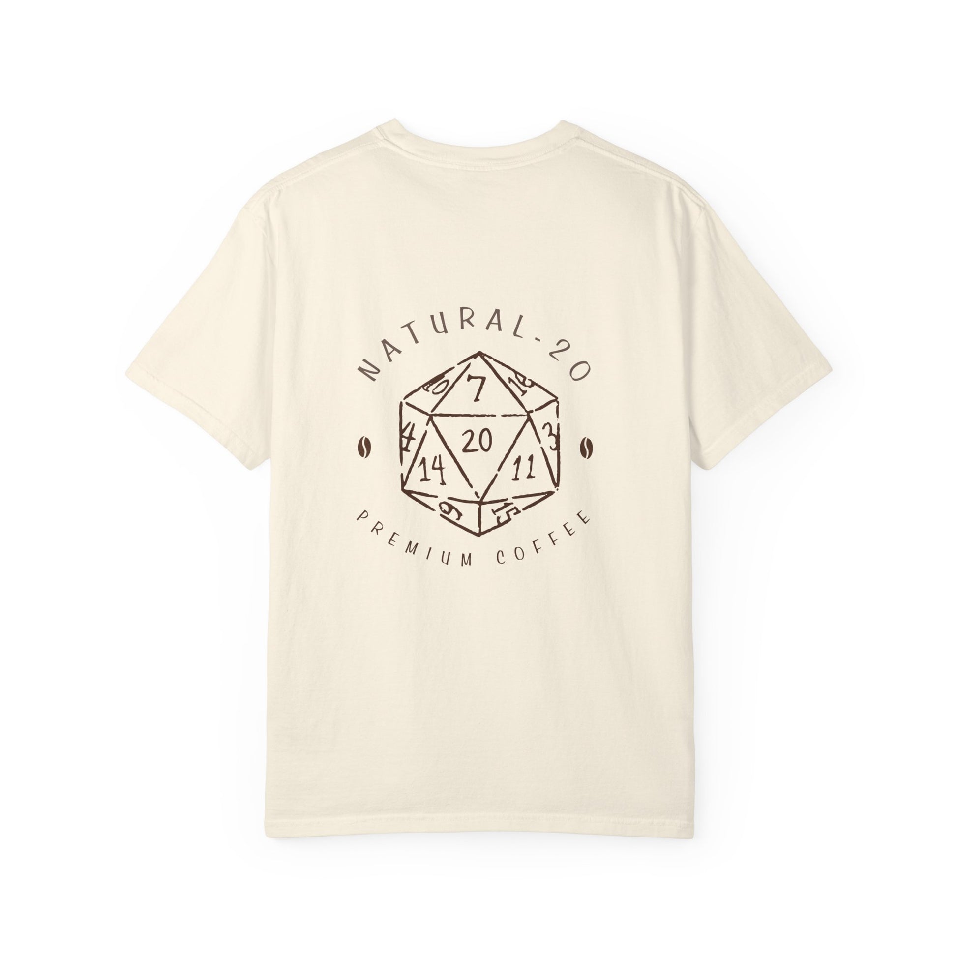 Introducing Natural 20 Coffees T-Shirts. A cozy tee made with 100% ring-spun cotton. The soft-washed, garment-dyed fabric brings extra coziness to your wardrobe while the relaxed fit makes it an excellent daily choice. The double-needle stitching throughout the tee makes it highly durable, while the lack of side seams helps the shirt retain its tubular shape.